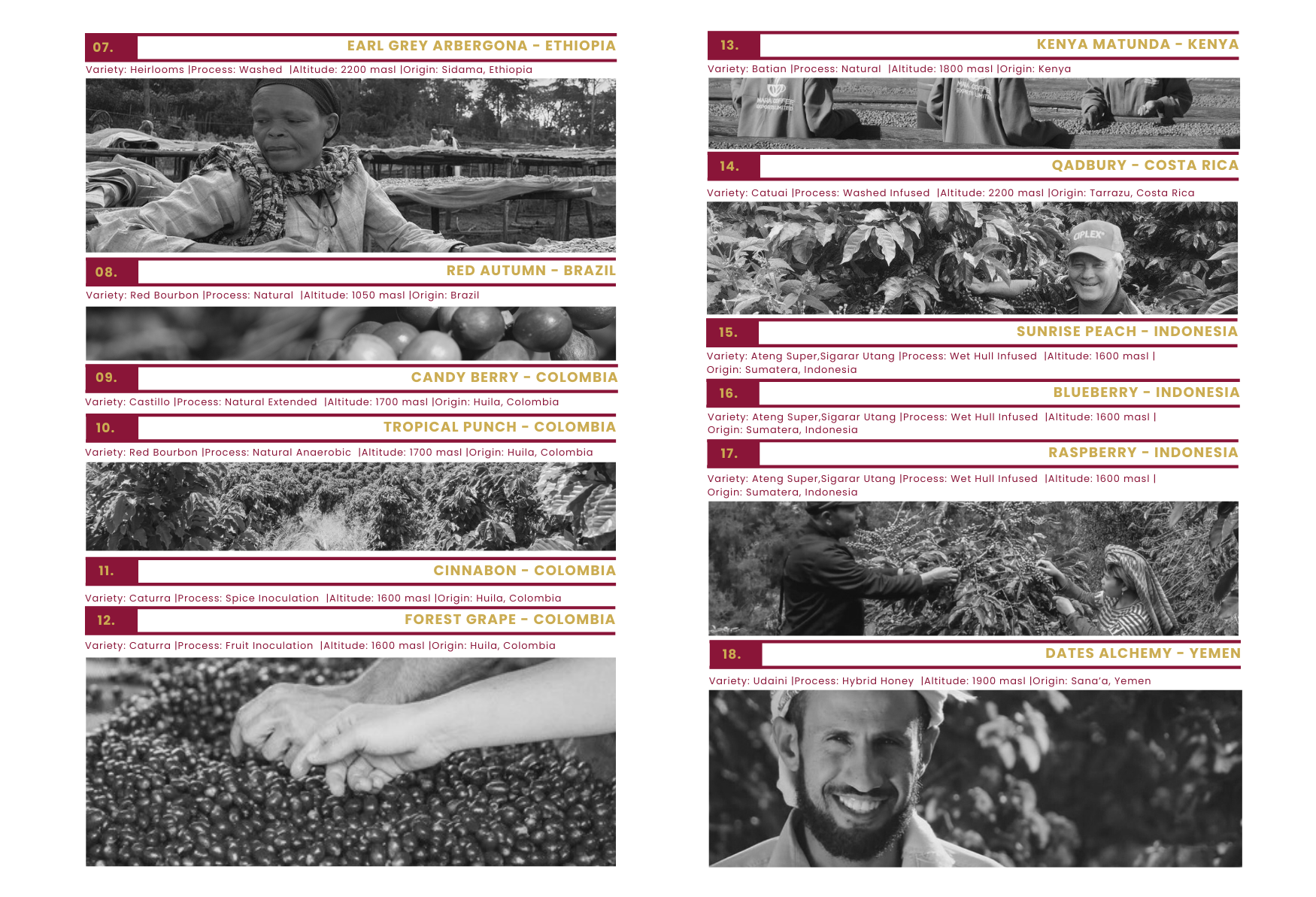 - Geisha Vu- Geisha Opal- Gold Liberica- Pinocchio- W1- Worka Cola- Earl Grey Arbegona- Red Autumn- Candy Berry- Tropical Punch- Cinnabon- Forest Grape- Kenya Matunda- Qadbury- Sunrise Peach- Blueberry- Raspberry- Dates Alchemy